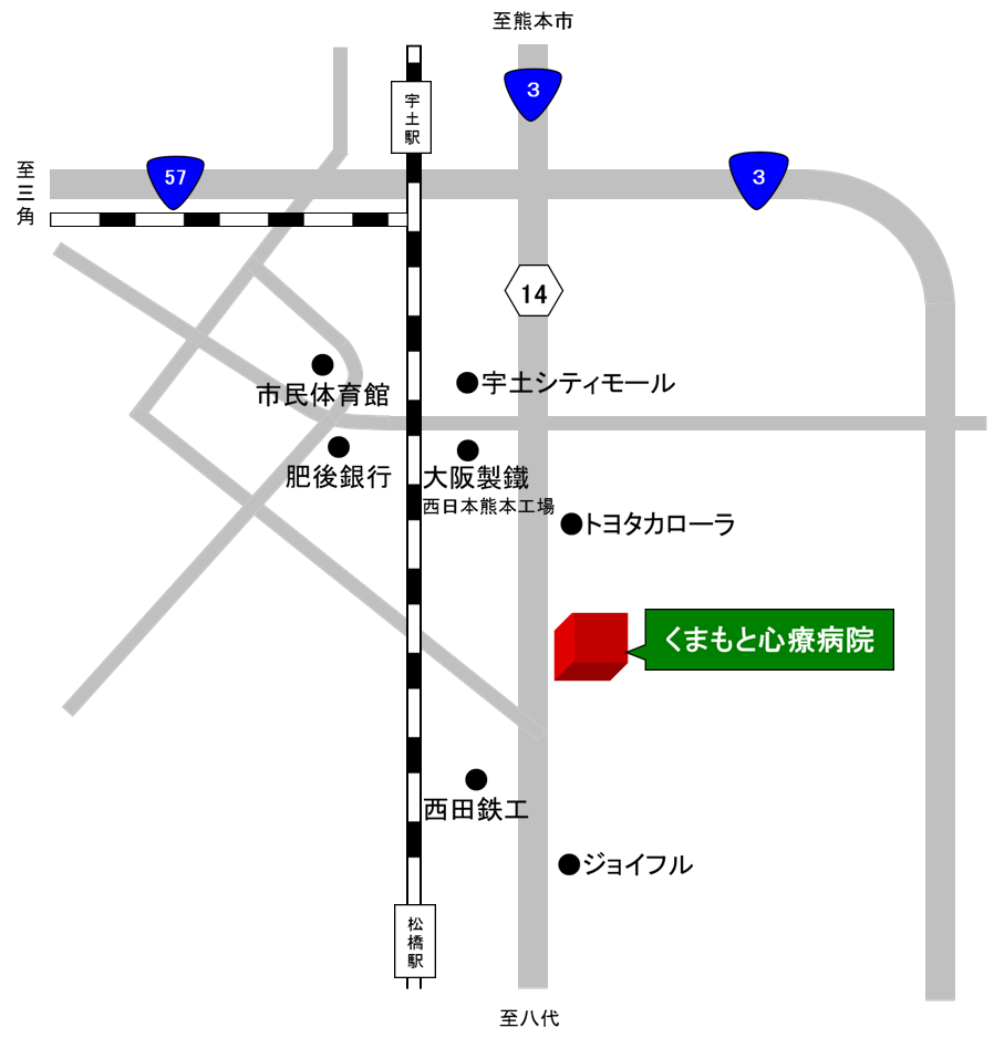 国道3号線を八代方面へ宇土市松原交差点を直進して(県道14号線)約5分
